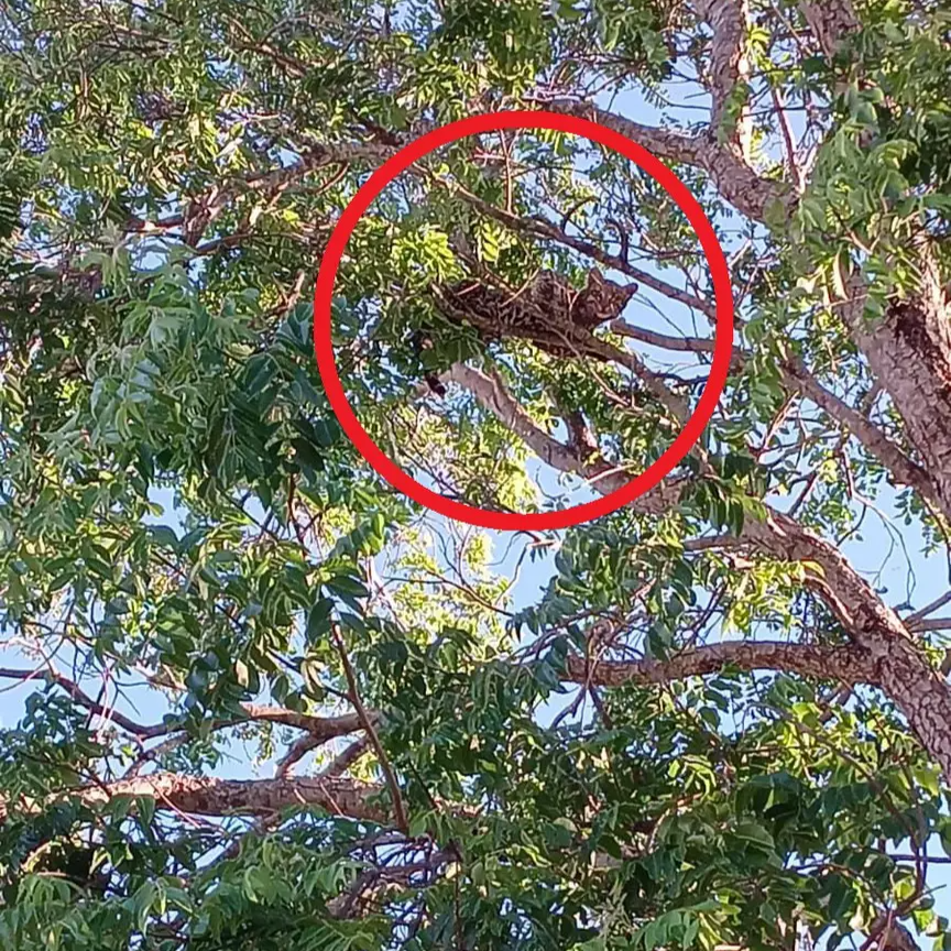 Uma jaguatirica adulta foi vista desde a madrugada desta segunda-feira (20) empoleirada em uma árvore do Bairro Vila Bandeira 2, em Bodoquena (Mato Grosso do