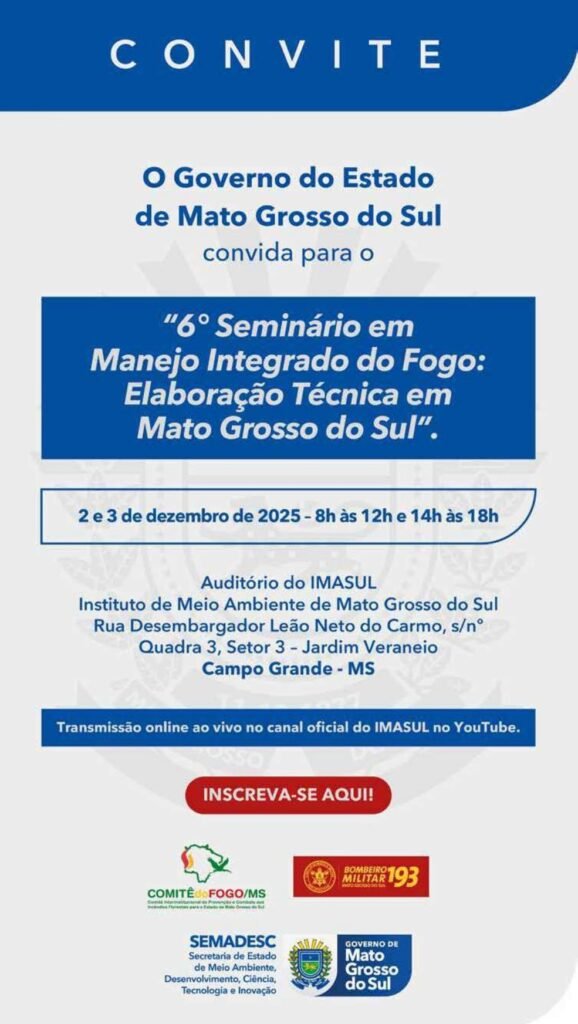 O Governo de Mato Grosso do Sul realiza, nos dias 2 e 3 de dezembro, o 6º Seminário em Manejo Integrado do Fogo, que neste ano traz como tema “Elaboração Técnica em Mato Grosso do Sul”. O encontro será no auditório do Imasul, em Campo Grande, com inscrições gratuitas e transmissão ao vivo pelo canal oficial do Instituto no YouTube.