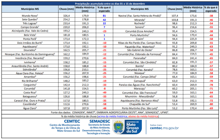 Na primeira quinzena de dezembro, apenas três dos pontos monitorados registraram volumes de chuva acima da média histórica. Em Mundo Novo, o acumulado foi de 326,4 milímetros, bem acima do esperado para o período. Sete Quedas e Três Lagoas também superaram a média, com volumes expressivos de precipitação.